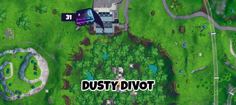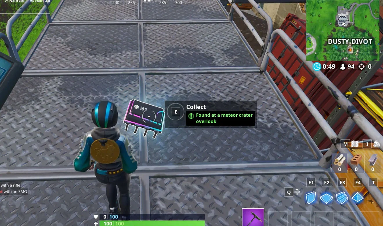 信じられないかもしれませんが、Fortnite マップにはまだ隕石によるダメージが残っています!場所は、当分の間生き残った破壊されたデポのダスティディボットのすぐ北にあります.このエリアに向かい、金属製の足場にあるデポの内側にフォートバイトがあります。