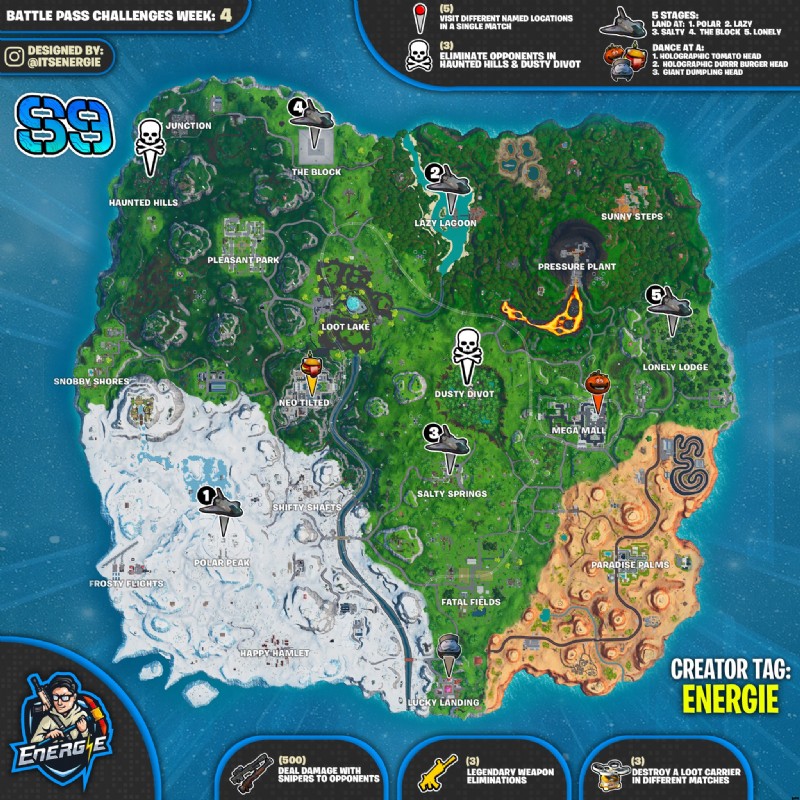 今週は、スナイパーライフルでダメージを与えたり、さまざまなマスコットの頭の中や上で踊ったり、レジェンダリー武器を除去したり、さまざまなマッチで戦利品キャリアを破壊したり、さまざまな場所に着陸したり、ホーンテッド ヒルやダスティ ディボットで敵を排除したり、さまざまな場所を訪れたりしています。 1 回のマッチで指定された場所に!