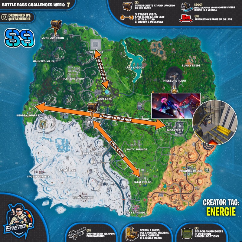 今週は、ジャンク ジャンクションまたはネオ ティルテッドでチェストを検索し、さまざまな名前の場所で弾薬箱を検索し、抑圧された武器を除去し、乗り物に乗っている間に敵にダメージを与え、1 回のマッチでさまざまな場所を訪れ、チェストを検索し、 1 回のマッチで自動販売機、キャンプファイヤー、5m 以下の距離で敵を撃破!