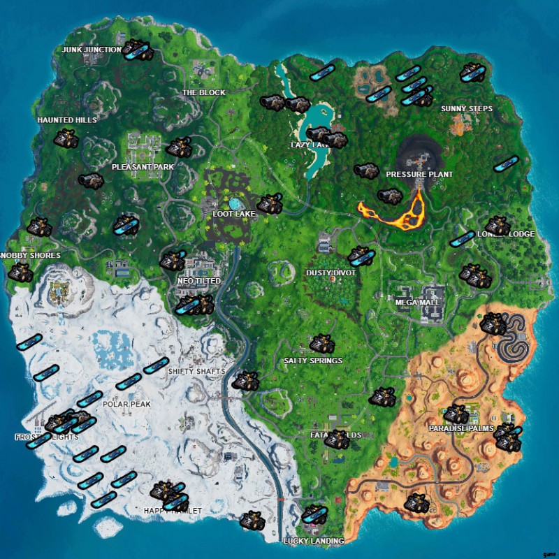 現在、ゲームには技術的には 4 つの車両がありますが、発砲できるのはそのうちの 3 つだけです!これを行うには、大砲、ドリフトボード、またはクワッドクラッシャーを見つける必要があります。ドリフトボードは雪のバイオーム、特に Frosty Flight や Happy Hamlet でかなり確実に見つけることができます。ここでもクワッドクラッシャーを見つけることができますが、マップ全体にさらに多くのスポーンがあります. Snobby Shores、Salty Springs、Fatal Fields にはすべてスポーンがあります。大砲はかなり限られたエリアにスポーンしますが、主にレイジー ラグーンに集中しています。