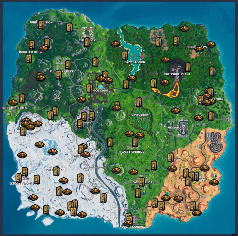 チェストは簡単に見つかりますが、自動販売機とキャンプファイヤーは少し難しいです。以下の場所の地図を見ることができます。キャンプファイヤーは常にそこにあるはずですが、自動販売機はスポーンする可能性しかありません!