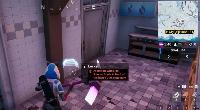 カウンターの後ろにジャンプして、フォートバイトの範囲内でサインスピナー エモートを使用します。ロックが解除され、収集できるようになります。