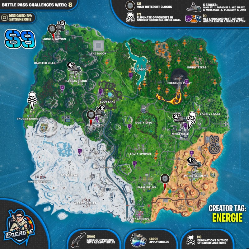 今週は、シールドを適用し、さまざまな時計を訪れ、スノビー ショアやメガ モールで敵を排除し、アサルト ライフルで敵にダメージを与え、さまざまな名前の付いた場所に着陸し、1 回の試合で火山の通気孔、通気孔、ジップラインを使用して、指定された場所以外での排除!