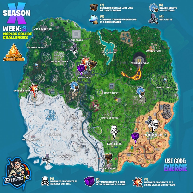 フォートナイト シーズン 10 Worlds Collide チャレンジ ガイド シーズン X バトルパスのこのミッションについて知っておくべきことをすべて説明します!この一連の目的を簡単に達成できる課題、解決策、報酬、チート シートの完全なリストがあります。