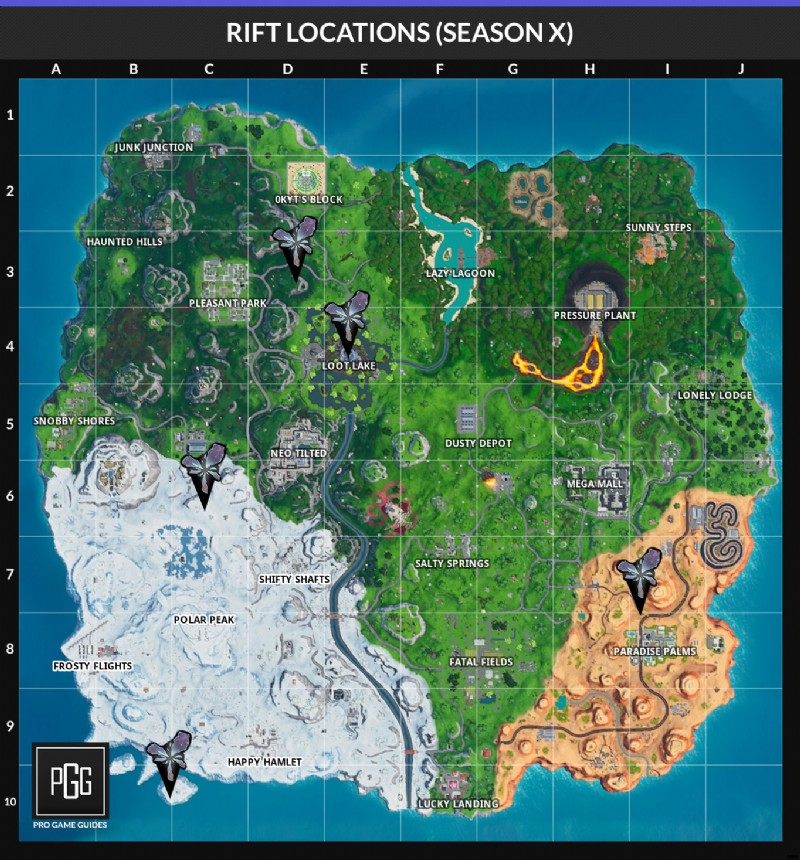 マップ上にはたくさんの裂け目はありませんが、ルート レイクの真ん中に信頼できる裂け目が 1 つあります。バトル バスから滑り降りることができます。下の地図で、残りの裂け目の場所をすべて見つけることができます。