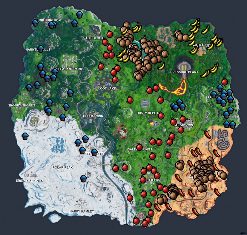 基本的に、このアイテムで見つけた採集アイテムを消費できます。場所の大部分を示す下の地図があります (クレジット:LootLake.info)。 Lazy Lagoonでココナッツを追いかけることをお勧めします.大量のスポーンがあります.また、ハッキングすると、そこの木から落ちることもあります。