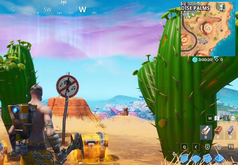 ノーダンシング サインの場所は長い間ゲームに存在しており、以前はチャレンジで使用されていました。今回は、標識を無視して法律を破るために踊るのではなく、標識を破壊しています。下の地図に記載されている場所の大部分を見つけることができますが、そのうちの 3 つに行って標識を破壊するだけで済みます。これらはすべて一度に行うことができます。ポーラー ピークから南西に向かう雪のバイオームに到達するのがおそらく最も簡単でしょう。