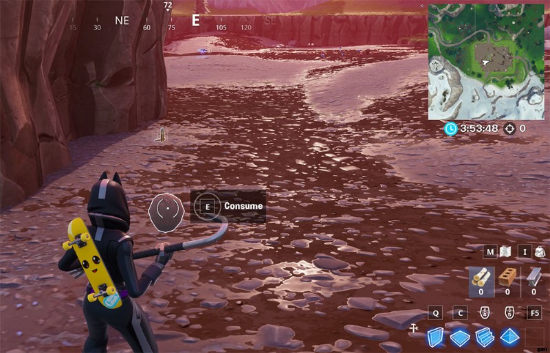 Giant Glowing Cube は浮島の真下にあり、ゆっくりとマップを周回しています。このガイドの執筆時点では、Greasy Grove の近くにあります。地図を開いて現在の場所を確認し、そこに向かって進んでください。