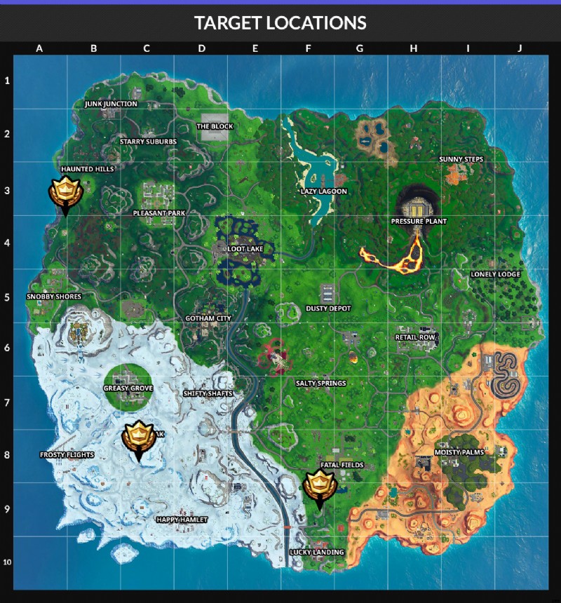 これは非常に単純なものです。マップ上に塗りつぶされるさまざまなブルズアイに着地するだけです。私たちの知る限り、現在 3 つの場所がありますが、これらはランダムである可能性があります。課題が出たら更新しますが、下の地図で私たちが知っているスポットをチェックしてください。