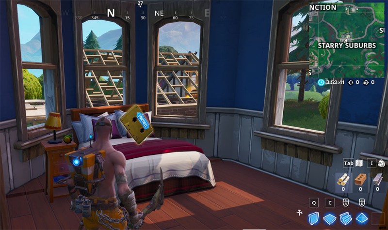 前方にバルコニーがあるのでそこに着陸してみてください。もしそうなら、ドアから中に入って左に行きましょう!階段のすぐ前にドアがあるはずです。その部屋の中にベッドがあり、その上にテープが浮かんでいます。