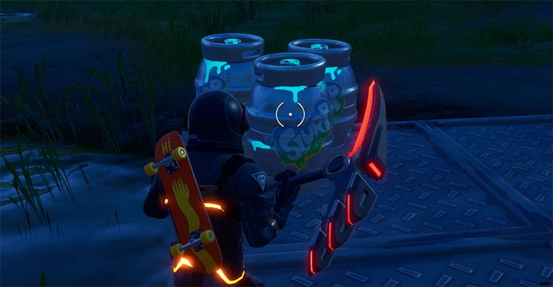 ヘルスとシールドを獲得するための新しい環境的方法がいくつかあります。そのうちの 1 つが上の写真です。マップの周り、特に Slurpy Swamp の工場で Slurp バレルを見つけることができます。あなたはこれらを破壊することができ、破壊するたびに10の効果的な健康を獲得します. Slurp を含む追加のオブジェクトも周りにあるので、特徴的な青いスライムが付いているものを探して、それを壊して回復してください!