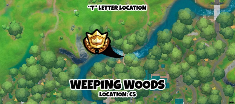 T の場所は、しだれの森の北部にある橋の下です。地図でよく見ることができます。木製の板張りのホワイト ウォーター セクションを探してください。