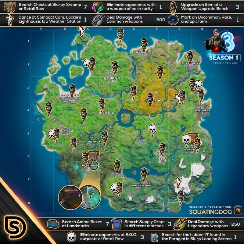 このフォージド イン スラープ チャレンジ ガイド このミッションの報酬を獲得するために完了する必要があるチャレンジのリストを順を追って説明します。 Epic はチャプター 2:シーズン 1 の内容を簡素化しました。バトル スターはなくなりました。獲得できるのは、バトル パスをレベルアップしてティア 100 に近づける経験値のみです!前シーズンのようにミッションが期限切れになることはないようですので、急いで完了する必要はありません。