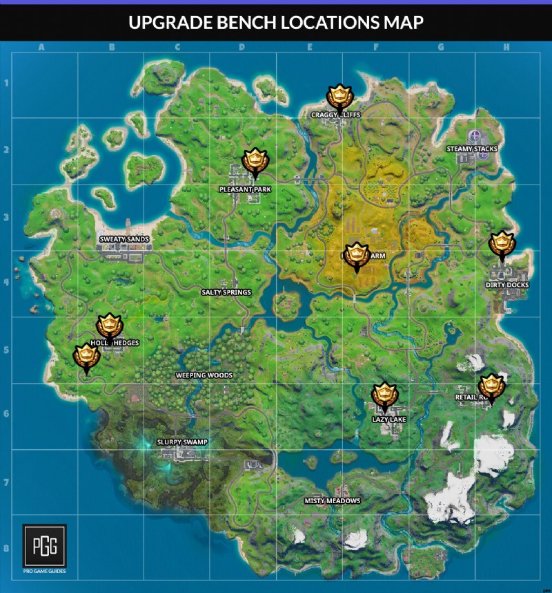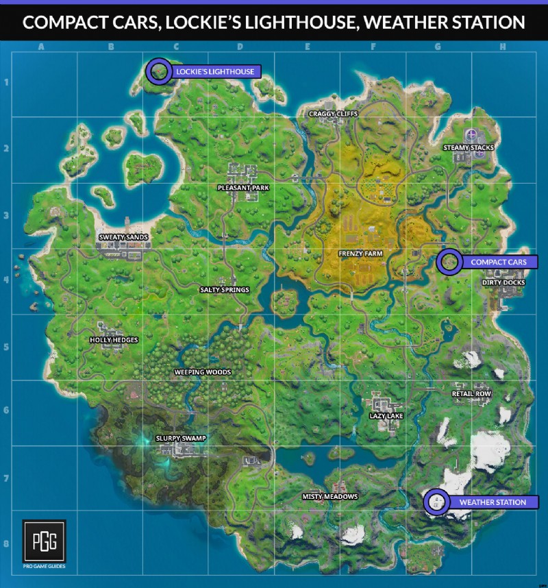 これらは、ゲームに追加された新しいランドマーク ロケーションの一部です。 Lockie's Lighthouse はマップの北西部にあり、それ自体がほぼ島になっています。コンパクトカーの場所はジャンクジャンクションを連想させ、ダーティドックの西に位置しています.ウェザー ステーションは、マップの南東部にある凍てつく山々にあります。正確な場所は下の地図で確認できます。