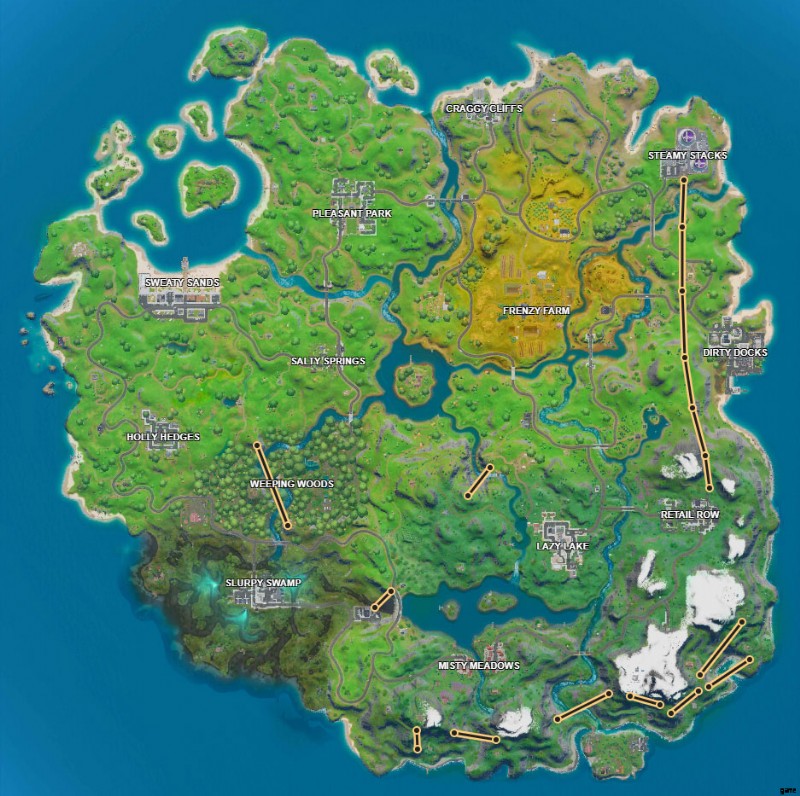 ジップラインはあまり多くなく、ほとんどがマップの東部と南部にあります。チャレンジを完了するには、2 つの異なるマッチのうちの 1 つに飛び乗る必要があります。