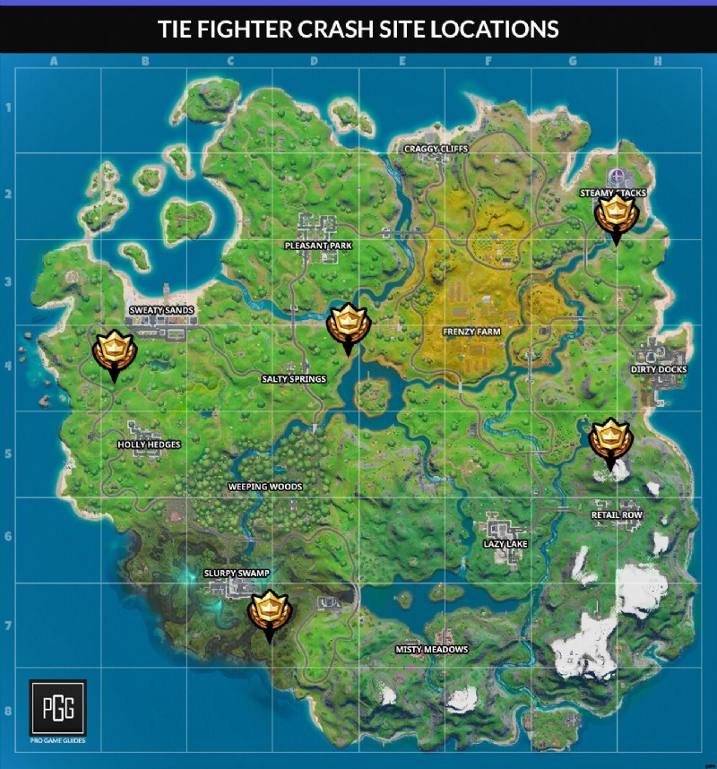 まず、ソロ、デュオ、またはスクワッドでのみこれを行うことができます!残念ながら、Team Rumble に飛び込んで実行することはできません。次に、TIE ファイターの墜落現場の場所の 1 つに行く必要があります。次のマップから 1 つ選択してください: