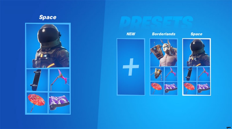 スキン、バックブリング、収穫ツール、グライダー、ラップを選択できるプリセットに名前を付けて保存できるようになりました。このようにして、何度も作り直さなくても衣装セットを保存できます。