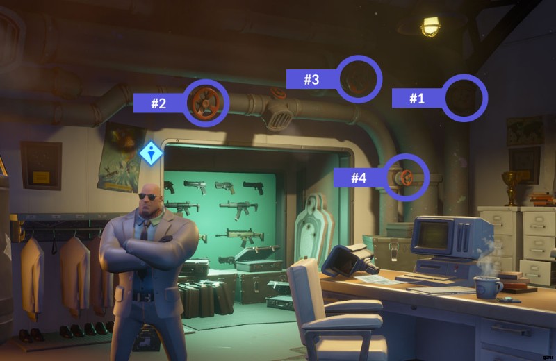 ブルータスの部屋に向かい、彼の後ろにある蒸気弁を探します。これらをクリックして、特定の順序でクリックすると、影に潜んでいたずらをしている隠されたエージェント ピーリーが明らかになります。蒸気がバルブから出てくるのを見れば、正しい順序で行っていることがわかります。正確な順序は下の画像で確認できます。