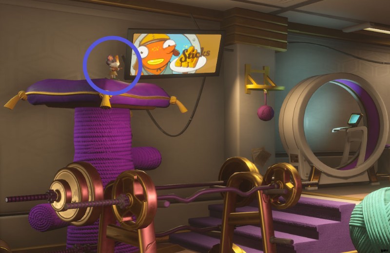 次はニャースクルズエリアへ!左隅に紫色の爪とぎポストがあり、その上に小さな猫のおもちゃがあります。止まり木から落とすには数回タップする必要がありますが、一度タップするとエージェント ピーリーが姿を現し、このチャレンジを完了します。