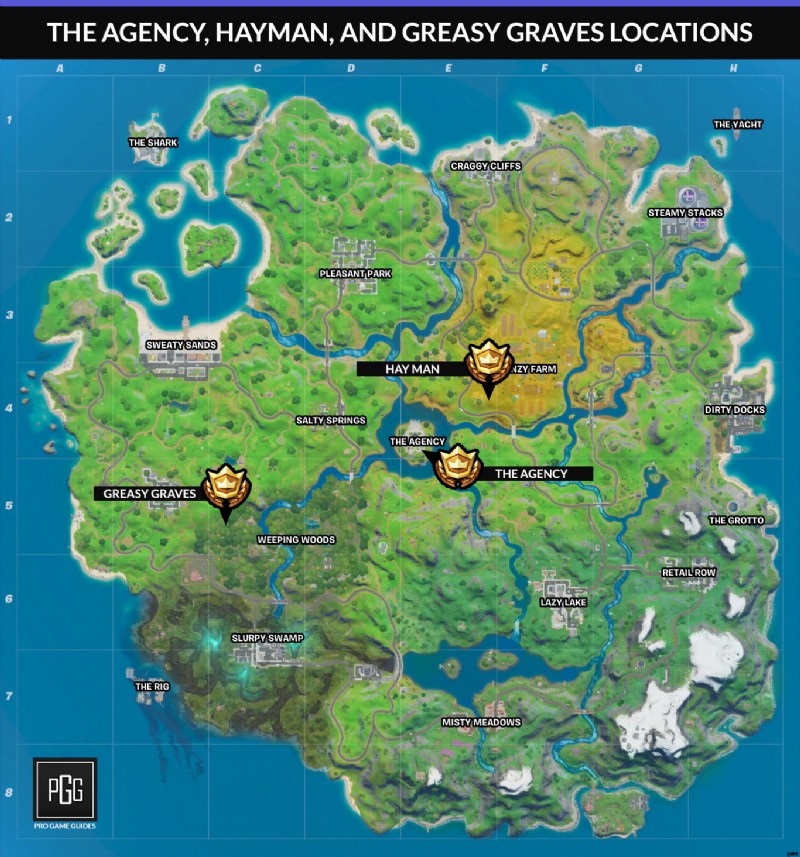 Agency、Hayman、Greasy Graves は、マップ上の次の場所にあります: