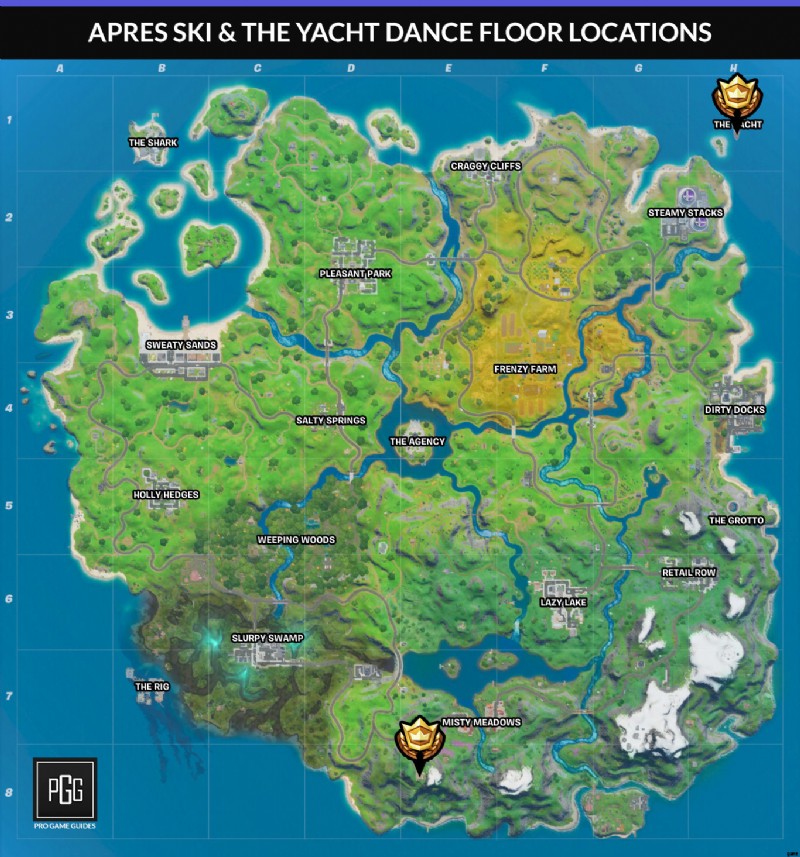 Apres Ski は、Misty Meadows の南西にあります。ロッジに入ってすぐ、ダンスフロアは1階になります。ヨットは地図上ではるか北東にあり、ダンスフロアは中央エリアのすぐ内側にあります.そのうちの 1 つで 10 秒間踊ることを忘れないでください。