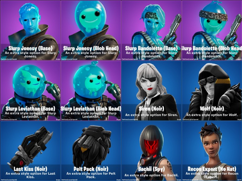 たくさんのスキンに新しいスタイルが追加されました! Slurp Jonesy、Slurp Bandolette、Slurp Leviathan、Siren、Wolf、Bachii、そして信じられないほどレアな Recon Expert まで!スラープ スキンはリアクティブでスタイルがありませんでしたが、必要に応じてブロブ ヘッドを選択できるようになりました!