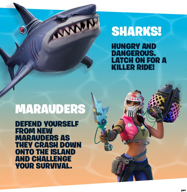 You can latch onto a shark and use it to get around the water like in the trailer. You'll have to be careful as well, because they will bite you if you get too close! Marauders will land on the island and attack, which is similar to the henchman in season 2.