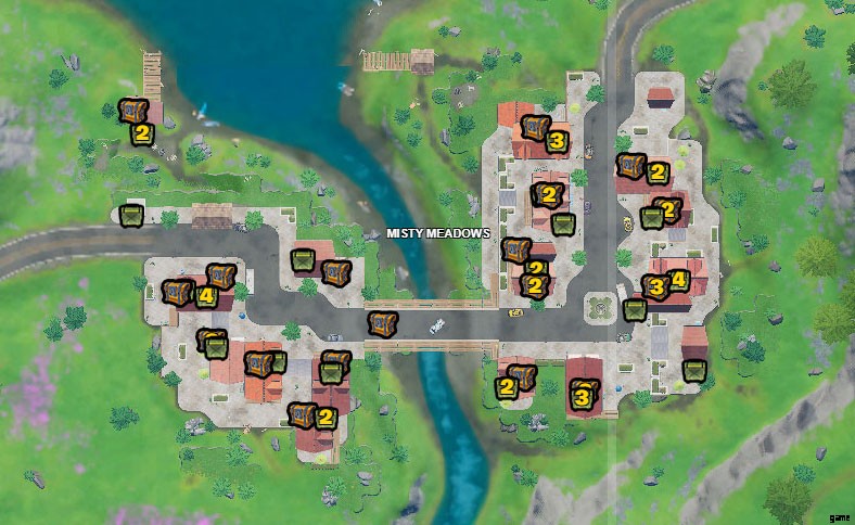 あなたのほとんどはおそらくMisty Meadowsに精通しているでしょうが、あなたが今知っているなら、チェストと弾薬箱を見つけることができる画像を含めました(LootLake.infoのクレジット).戦利品のスポーンが非常に多いため、非常に人気のあるスポットなので、チームランブルに向かうことをお勧めします.