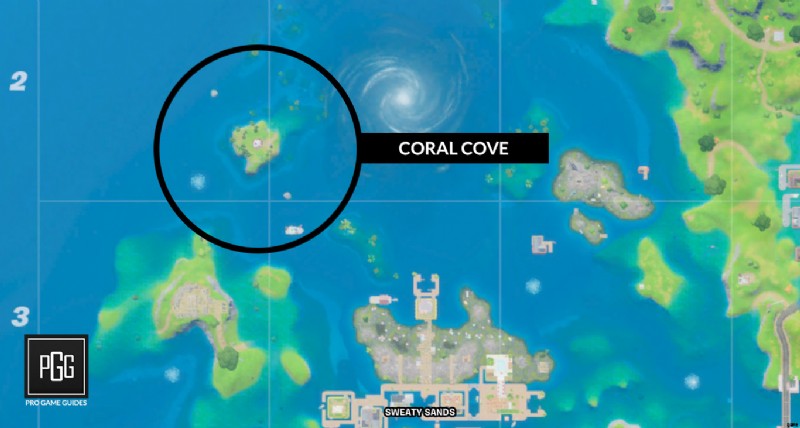 Sweaty Sands の北西にある Coral Cove があります。また、マップのこの部分の大部分を占める巨大な渦巻きのほぼ真西にあります。飛行機でこのエリアに入ると、着陸できるちょうどいいサイズの島が 1 つあります。