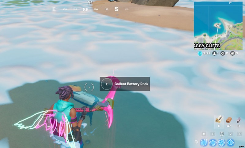 これらの各部品は、近くにいると音を立てます。最初の部品は、入手できる場所を見つけるのは簡単ですが、見るのは難しい場合があります.宇宙船のある島のすぐそばに水から突き出た岩があります。岩を砕いて水の中を見下ろすと、バッテリー パックが見つかるはずです。この場所は海の泡で覆われているため、十字線をこの場所の周りに移動して見つけてください。