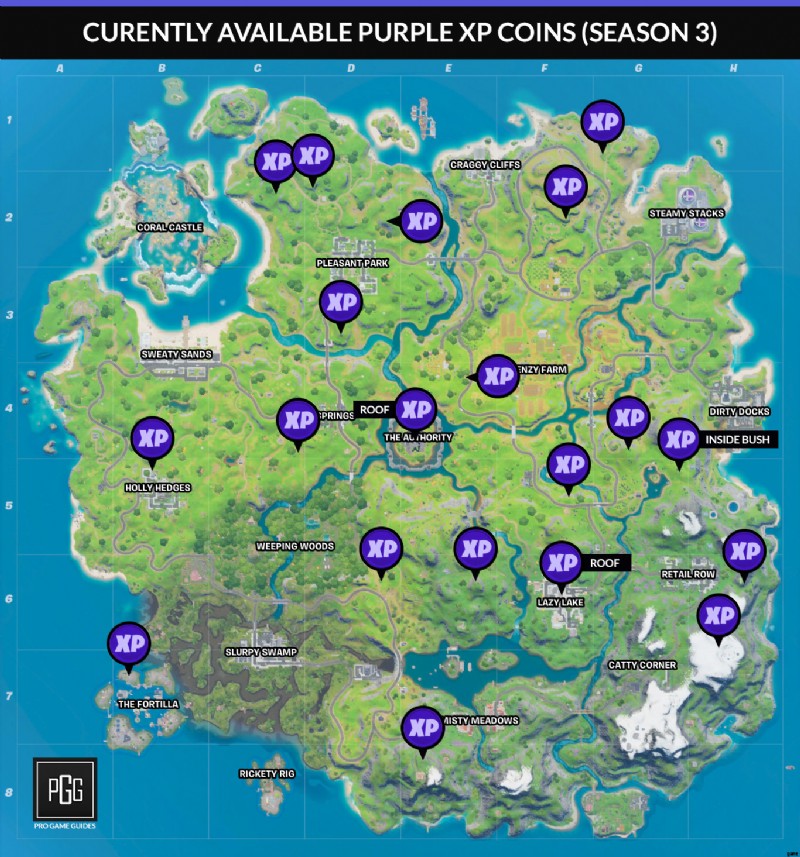 現在利用可能なすべてのパープル XP コインを 1 つのマップで確認できます。少し違う場所に表示されるものを更新しました。見つからない場合は、コメントでお知らせください!