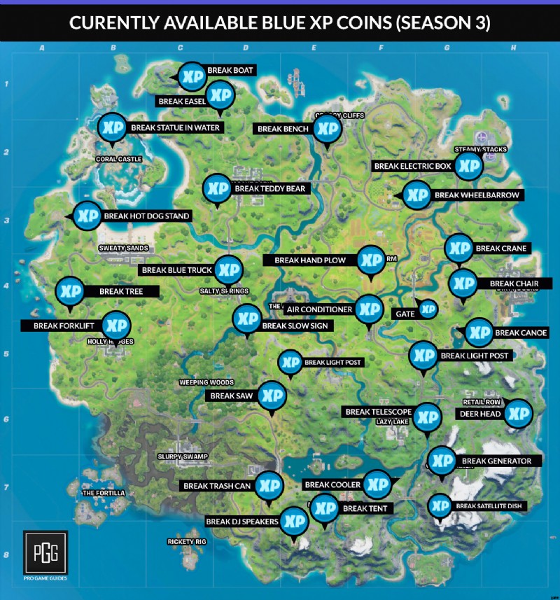 2020 年 7 月 2 日より、ブルー コインがゲーム内で収集できるようになりました。これらはシーズン 2 とは異なり、以前は時間が設定されていました。代わりに、コインを表示するには、青いちらつきのある特定のアイテムを壊す必要があります。これらは見つけるのが難しい場合がありますが、見つけ次第すべての場所をご用意します。青いコインは、1 枚集めるごとに 6,500 XP を獲得できます。