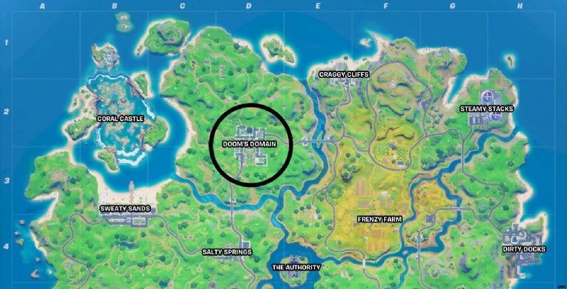 Doom's Domain に入ったら、徘徊しているヘンチマンに注意する必要があります。電話ボックスに飛び込んで変装することも、爆破して通り抜けることもできます。ドクター・ドゥームは通常、マップの最北端にある彼が住居とした家で見つかります。これは、中央にある大きなドクター ドゥーム像のすぐ北にあります。彼は彼の力を使うことができるので、彼と戦うときは注意してください。彼の爆弾は構造物に火をつけます!彼を倒すと、彼の能力のいずれかを装備し、それらを使用してプレイヤーを排除できます.これらは、除去の合計にカウントされるため、残りのヘンチマンにも使用できます。