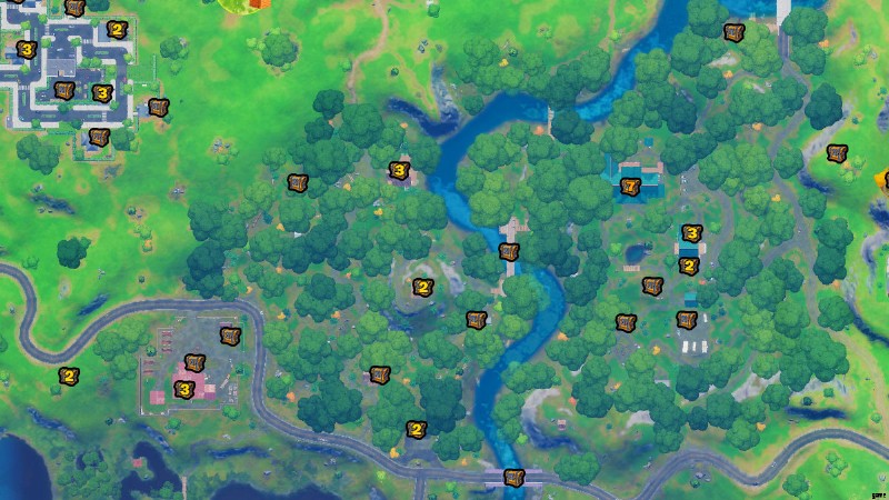 見つけなければならないチェストについては、しだれの森を走り回ることになります。ただし、ウルヴァリンは森林地域を歩き回って不運なプレイヤーを探しているため、注意が必要です.マップは Fortnite.gg の功績によるものです。