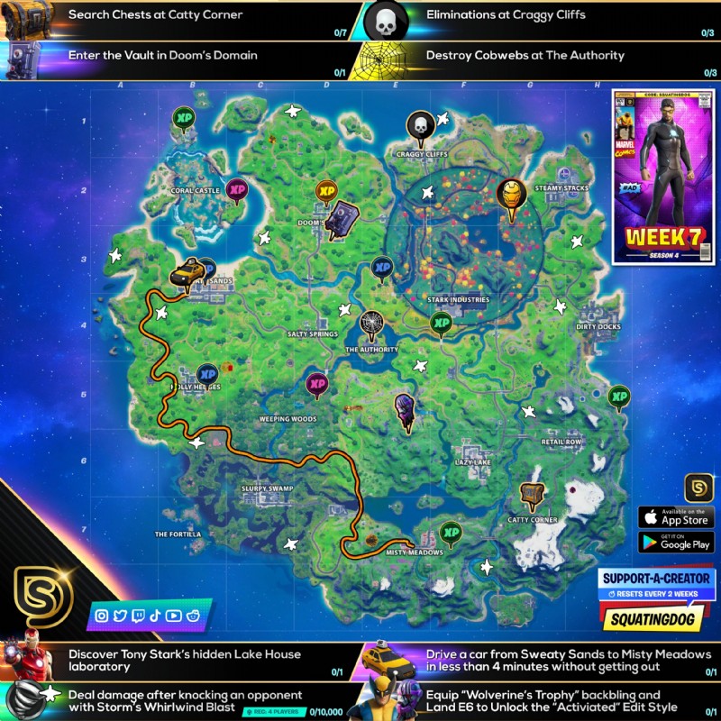 ウルヴァリンの衣装を手に入れた可能性が高いので、今後数週間の挑戦は少し刺激的ではなくなります.彼らのこのバッチは、私たちがチェストを集め、クラギークリフで排除し、ドゥームズドメインの保管庫にあるものを発見し、オーソリティでクモの巣を破壊し、トニースタークの隠された研究所を見つけ、車を運転するためにキャティコーナーに向かいますそこから抜け出さずにマップを移動し、ストームのスーパーパワーの 1 つでかなりのダメージを与えます!