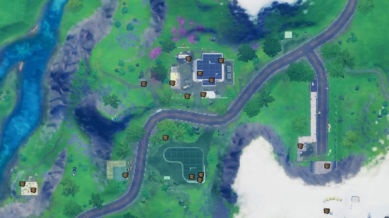 Catty Corner はマップの南西部にあり、北部にはかなりの数のチェストがあります。南にあるガソリンスタンドも、そこで人に出くわしたり、他のチェストがスポーンしない場合は、チャレンジにカウントされます.いつものように、チェスト コレクション チャレンジには Team Rumble に参加することをお勧めします!マップは Fortnite.gg の功績によるものです。