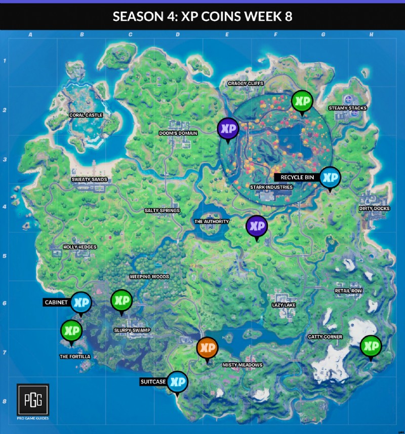 Fortnite チャプター 2:シーズン 4 第 8 週のすべての XP コインの場所を示したマップです: