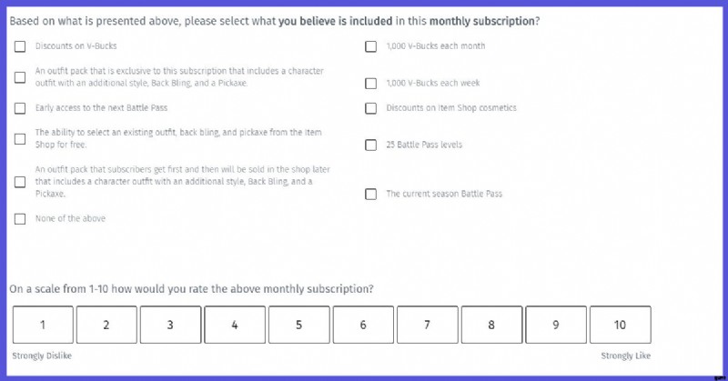 Epic は、ゲームの現在の状態と将来のアップデートの可能性に関する意見を収集するためにアンケートを送信することがあります。これらの調査のもう 1 つが最近送信され、興味深い質問が含まれていました。その質問は、「上記の内容に基づいて、この月額サブスクリプションに含まれていると思われるものを選択してください。」上の画像は表示されたものであるため、明らかにエピックは、潜在的な取引の広告が人々がそれを理解するのに十分であるかどうかを判断しようとしていました.表示されたリストと、サブスクリプションを評価するオプションを次に示します。