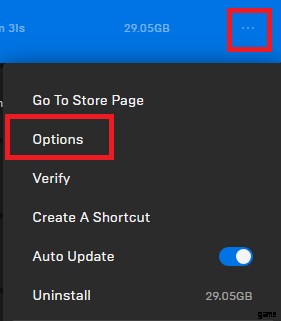 - Fortnite の横にある 3 つのドットをクリックし、オプションをクリックします。