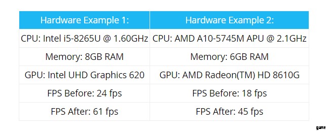 以下は、720p で Fortnite を実行している 2 台のローエンド ラップトップの Epic Games Web サイトから取得した写真で、パフォーマンス モードを使用しない場合と使用した場合でゲームがどのように動作するかを比較しています。自分で結果を見てください。