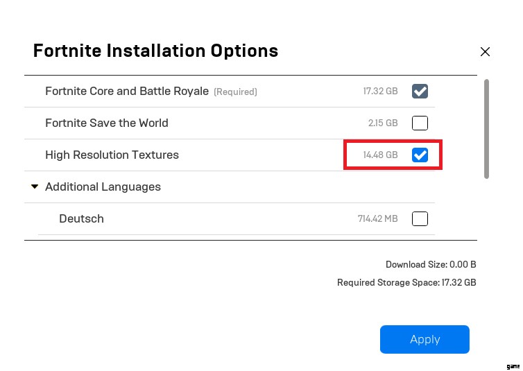 - 次に、14.48GB の横にあるチェックボックスをオンまたはオフにします。チェックすると、高解像度のテクスチャがダウンロードされます。チェックが入っていない場合は、ダウンロードされません。