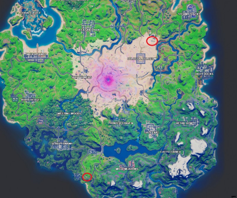 上の画像から、2か所が離れているのが誰なのかが分かります。ピザ ピットはコロッサル コロシアムの北東にあり、ピザ フード トラックはスラーピー スワンプの南東にあります。