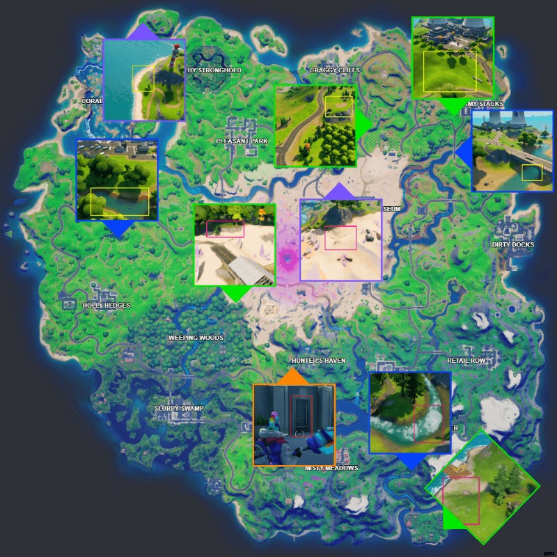 ゼロ ポイント マップ上には毎週 10 枚の XP コインがあり、グリーン、ブルー、パープル、ゴールドの 4 つの異なる色があります。これらのコインを見つけることで得られる XP は、それらの色の希少性に応じて異なります。そのため、ゴールド XP コインを取得すると、グリーン コインを見つけるよりも多くの利益が得られます。
