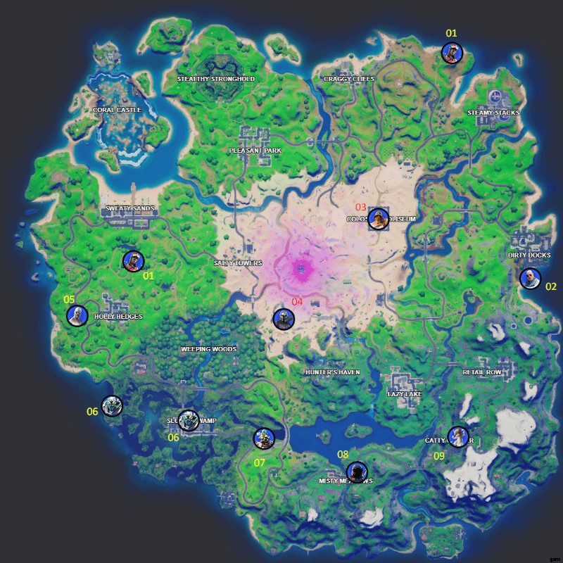 このレジェンダリー チャレンジでは、最初のステージの完了で 55,000 XP、残りの 4 つのステージで 22,000 XP を獲得できます。ステージごとに 5 ずつ増加するため、5、10、15、20、25 のデュエルでポイントが付与されます。以下に、決闘を希望する NPC のすべての場所をリストします。これは、どこに着地しても、最も近い NPC に行くことでこのクエストを簡単に進めることができることを意味します。 Fortnite GG に感謝します 地図描画機能のために!