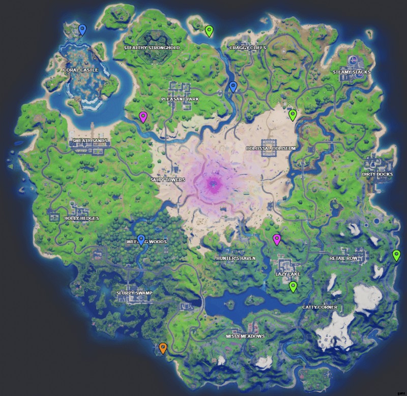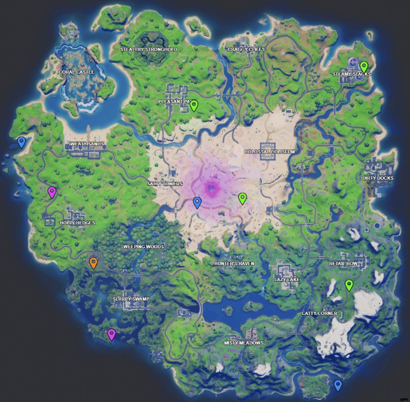 マップ上の 10 枚の XP コインのうち、4 枚がグリーン コイン、3 枚がブルー、2 枚がパープル、1 枚がゴールド コインです。 Blue Coins を覚えている人にとっては、それらを見つけるためにオブジェクトを壊す必要はもうありません。それらはすべて水中でスポーンするようになりました。