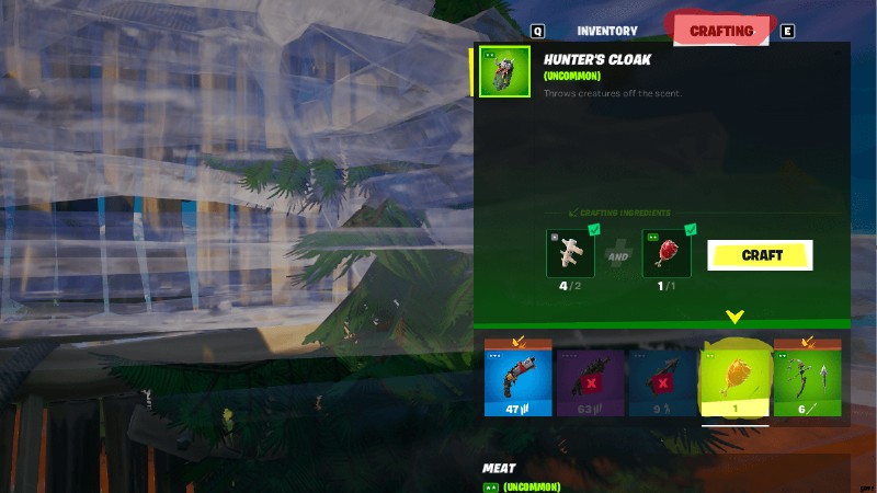 そこに着いたら、肉のアイテムを選択します それはインベントリにあります (上の画像で黄色にハイライトされています)。必要なすべてのリソースがある限り、ハンターのマントを作成するオプションが与えられます!必要なリソースがすべて揃っていない場合は、ハンターのマントの横に小さな赤い X が表示されます。