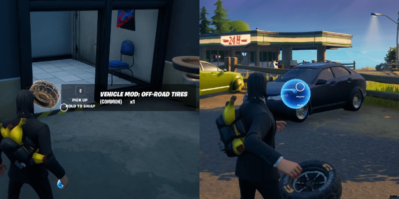 タイヤを回収したら、いつものように回収できます。インベントリでそれを選択し、セカンダリ トリガー ボタンを使用します 手榴弾のように手に持ってください。オフロード タイヤを追加する車に向けて、プライマリ トリガー ボタン を使用します。 投げます。自動的に車両に装着され、運転の準備が整います!