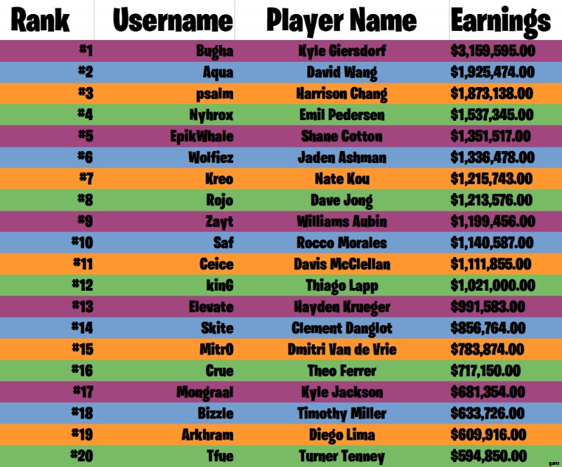 前述のように、このリストのランキングはめったに変わりません。巨額の賞金を提供するトーナメントが頻繁に開催されていても、このリストから誰かを追い出すほどのお金を稼ぐことはめったにありません。この主な理由は、多額の賞金を獲得できるトーナメントのほとんどがデュオ、トリオ、またはスクワッドであり、ソロはめったにないためです。トーナメントでは勝者が総取りになることはめったにないため、ほとんどの場合、賞金は賞金プールに記載されている額よりも大幅に少なく、パーティー全体で分割されます。