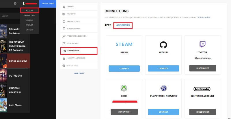 この新しいページの左側のメニューで、[接続] を見つけてクリックします。 そこから、[アカウント] をクリックします。 アプリの横にある 上の画像が表示されます。この画面には、Epic アカウントにリンクできる 6 つのアカウントが表示されています。