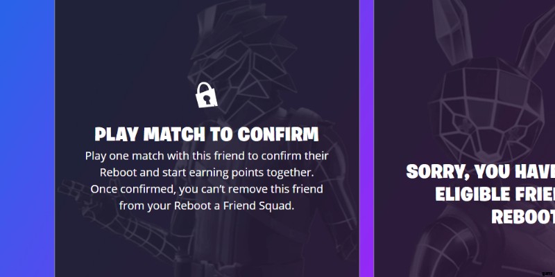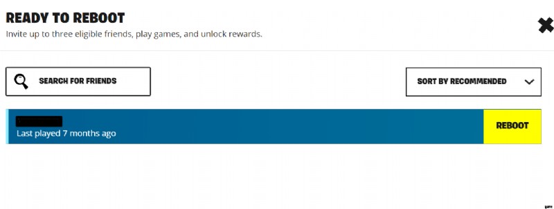 ここで、ゲームに戻すフレンドを選択します。 再起動 のいずれかをクリックします。 ページ上のボタンを使用して、新しいウィンドウをポップアップ表示します。このウィンドウには、資格のある友達の全リストが表示されます。フレンドが「フレンドを再起動」イベントに参加するには、Fortnite を使用していない必要があります。 少なくとも 30 日を占めます。過去 30 日以内にログインしたプレイヤーは、ここには表示されません。